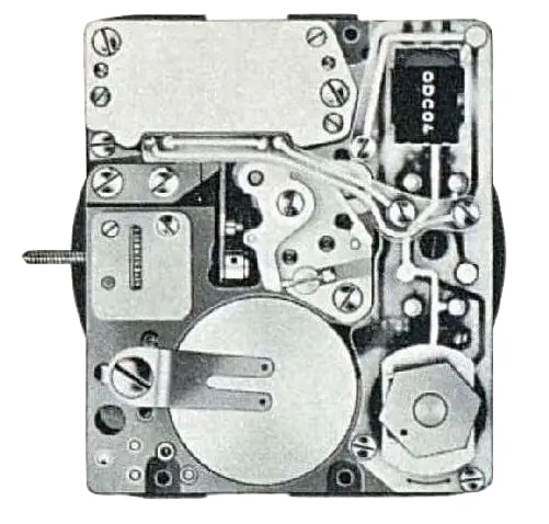 Raymond Guye of the ‘wafer lab’ within the semiconductor laboratory of Kurt Hübner, succeeded to concentrate all electronics on a single bipolar IC (ODC-4) and drew the layout, made of 110 components. Guye succeeded where Faselec had failed, namely in mass producing the integrated circuitry for the Beta 21. Although primitive by today’s standards, it was a feat of manual layout and resulted in a a chip just 2 mm on a side. As mentioned in the explanations above, the movement was a derivate of Beta 2 and consisted further of the 8192 Hz oscillator, a five stage binary divider chain and the vibrating motor at 256 Hz. It is not to forget, that this ODC-4 IC was the first monolithic, bipolar IC in Europe (1, 6, 13, 16).