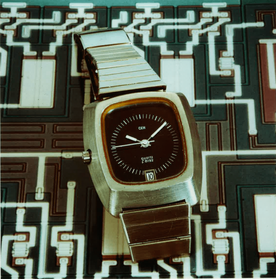 The Beta 21 design was showing its age. Most companies had settled on a dead beat stepper motor design, as pioneered by the Beta 1 and Seiko Astron and famously adopted by Girard-Perregaux with their 32 KHz Cal. GP350. Girard-Perregaux and Seiko also lead the way in leveraging American semiconductor expertise, partnering with Motorola and Intersil respectively, for advanced integrated circuits. This dramatically reduced power consumption and allowed the use of faster oscillating crystals. Where the Beta 21 operated at 8192 Hz, most quartz watches since the mid-1970s have used a crystal vibrating at 32 KHz (2).