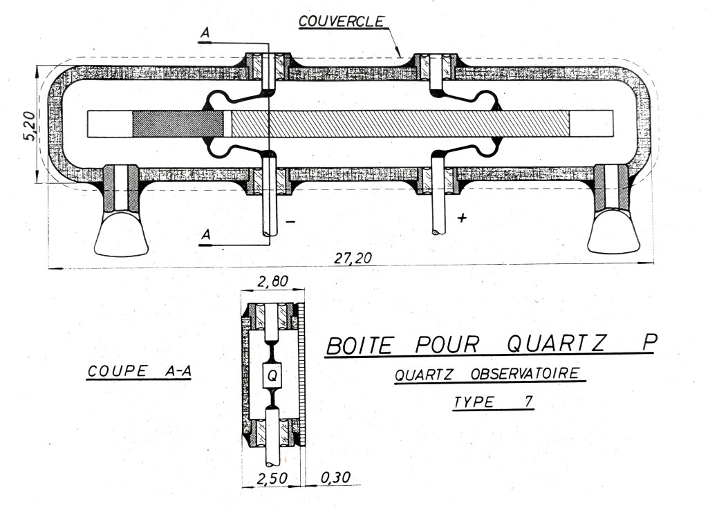 The ‘P’ before the ’40’ indicates the use of small (23.4 x 1.2 x 0.8mm) Prototype X-Y cut P-Quartz bars (Observatory quartz types, 5 to 7) smaller than the then usual O-Quarzes (Observatory quartz types 3 and 4; 30 – 40mm) used for observatory standard clocks and laboratory reference clocks at the CEH. After hand cutting and finishing the quartz bars, they were metal coated to allow for an appropriate electrical field inside the quartz upon application of an electric tension from outside (2).