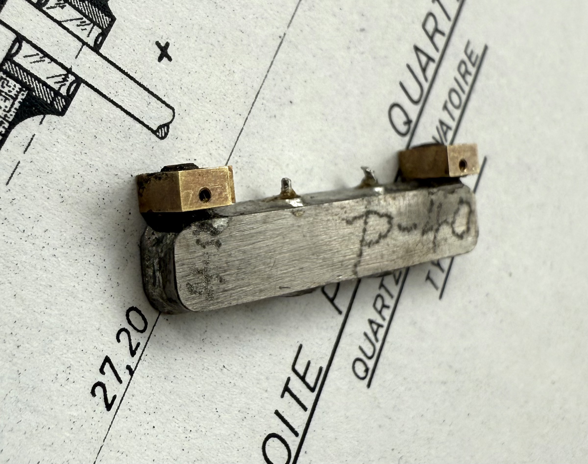 Two small rods as continuity of the quartz suspension protruding from one narrow flank between the two brass blocks are used for connecting the electric alimentation and control circuitry. On the opposite narrow flank two soldered openings hide the other two quartz suspension rods. Both major surfaces of the capsule hand engraved ‘P-40′ and on one same surface but a little smaller a hand engraved ’40’.