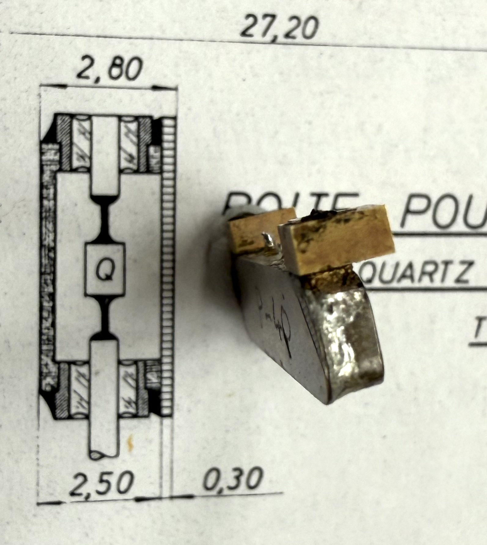 When this module was recently tested at the Integrated Circuits Laboratory of the ETH in Zurich (Switzerland), the hand cut quartz bar inside showed normal response to an appropriate electrical excitation.
