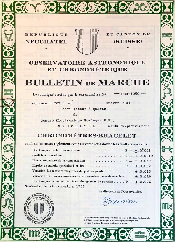 The ’40’ of the engravings ‘P-40’ corresponds to the numbering of these quartz modules of which not more than 50 were made (1). ‘P-41’ for example was used in CEH-105 Beta 1, see a picture of its ‘Bulletin de Marche’ below.