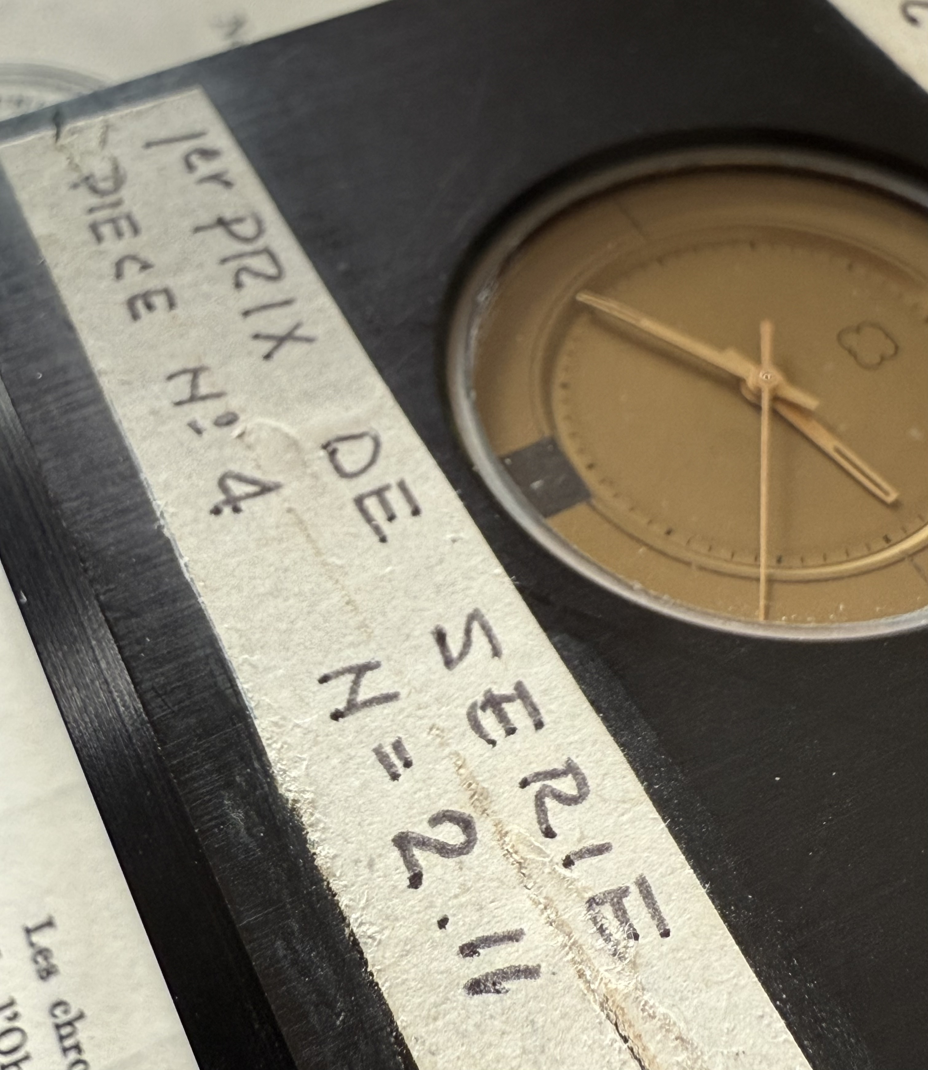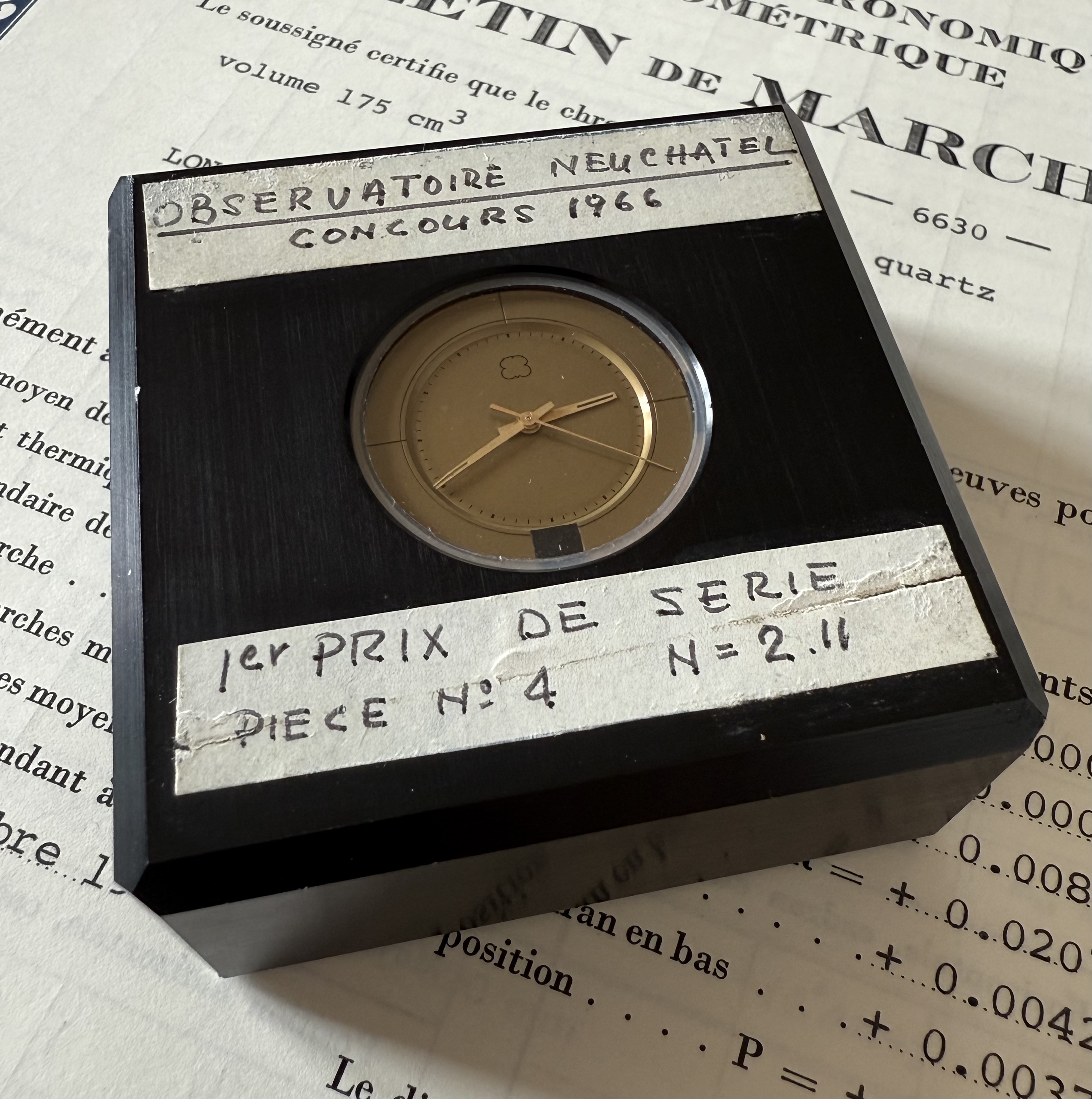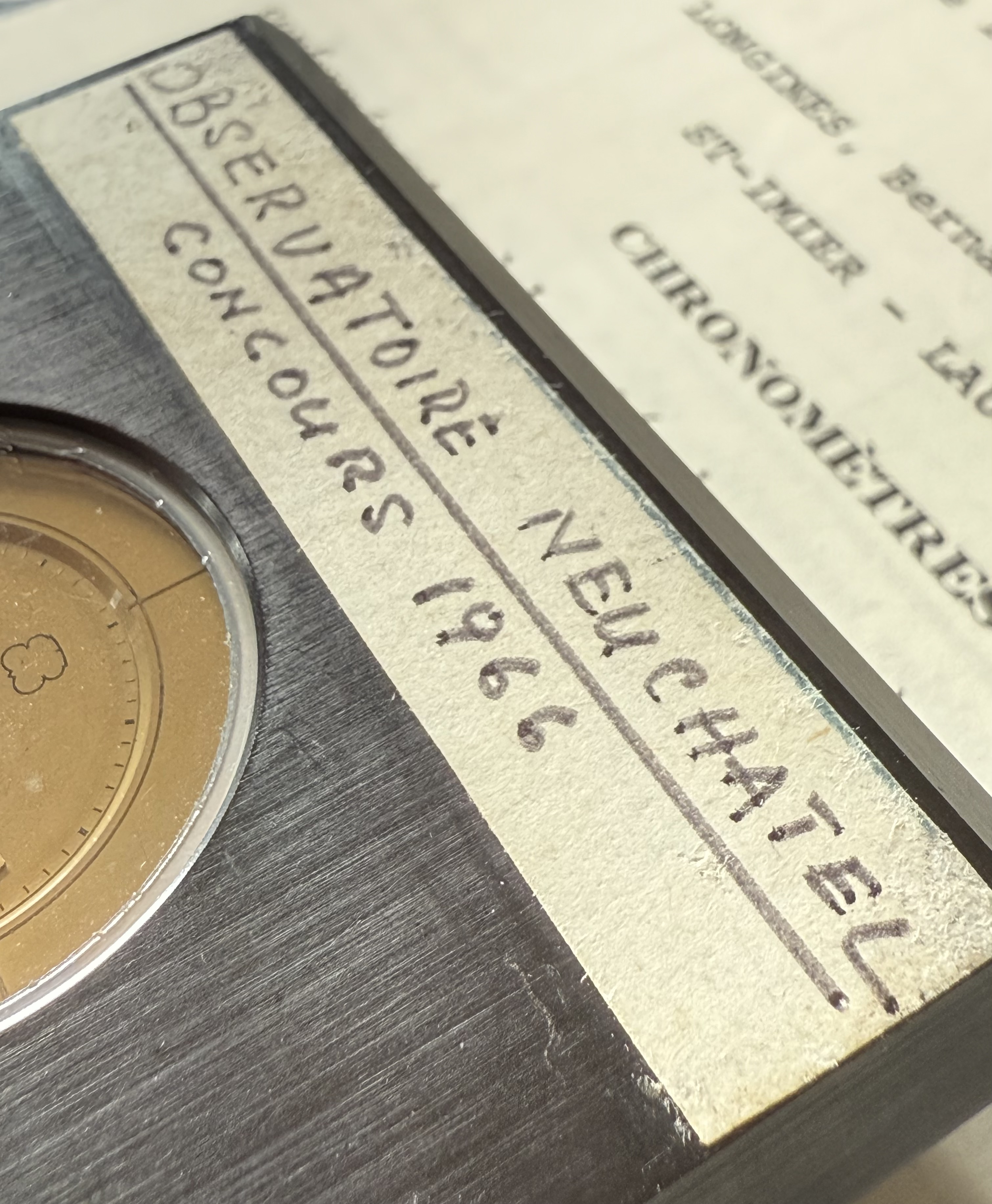 This prototype #4 participated to the chronometer competition of the observatory in Neuchâtel in 1966 in the category of ‘electric chronometers’ and reached 3rd place. The achievements of the caliber are noted in André Beyner’s handwriting on two white stickers on the front of the piece.