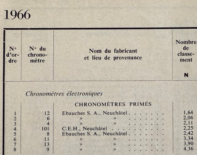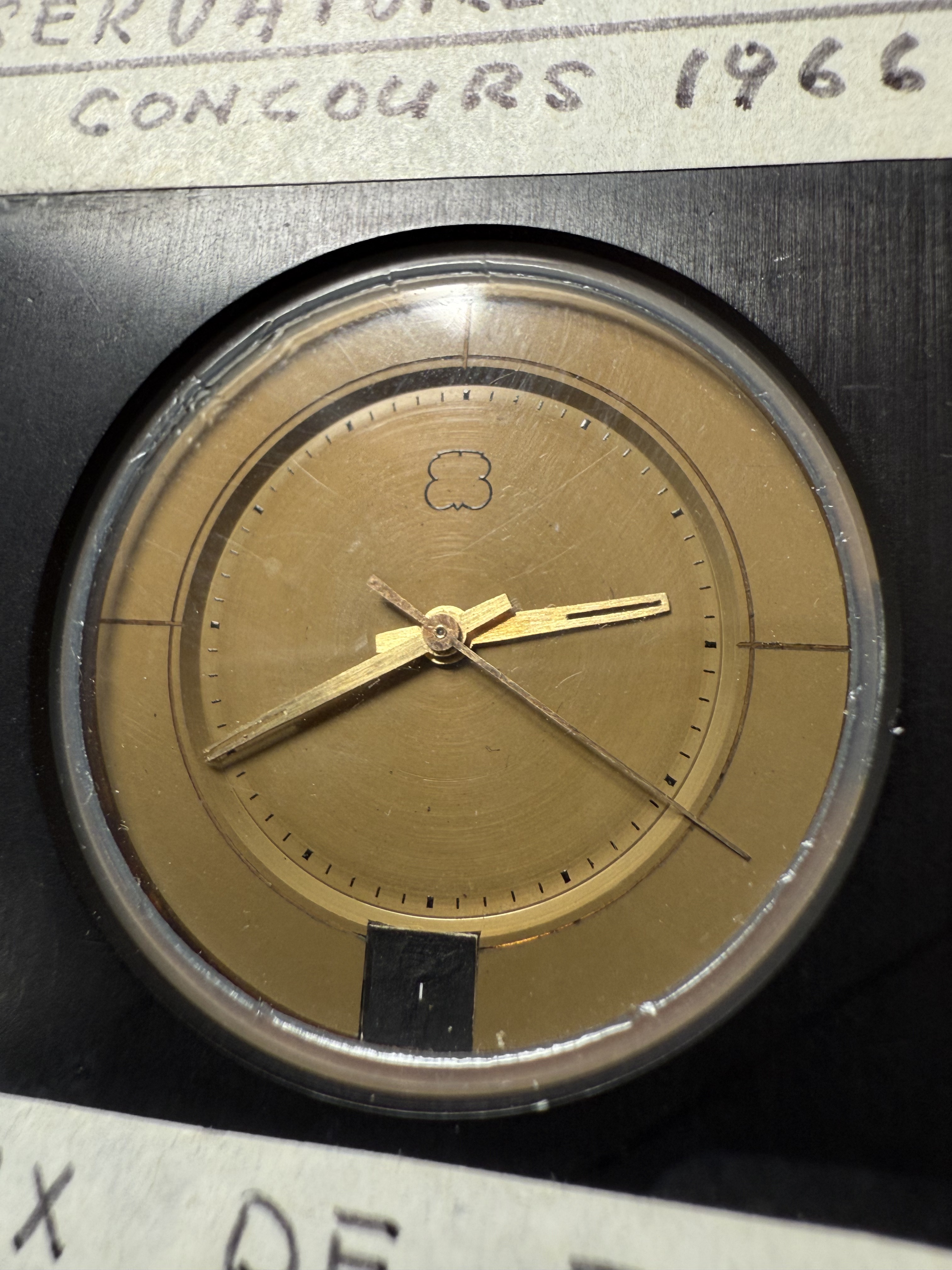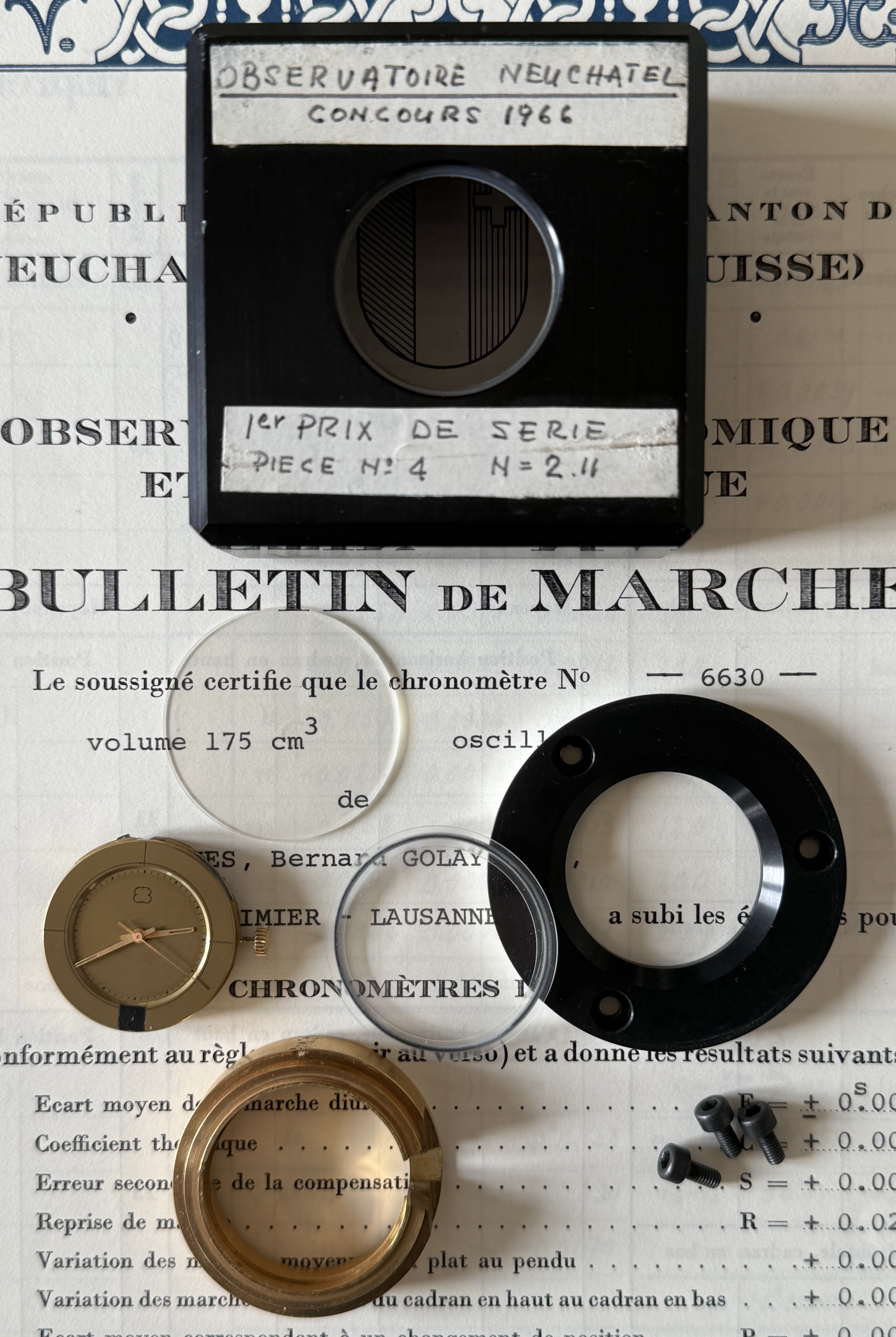 This prototype #4 participated to the chronometer competition of the observatory in Neuchâtel in 1966 in the category of ‘electric chronometers’ and reached 3rd place. The achievements of the caliber are noted in André Beyner’s handwriting on two white stickers on the front of the piece.