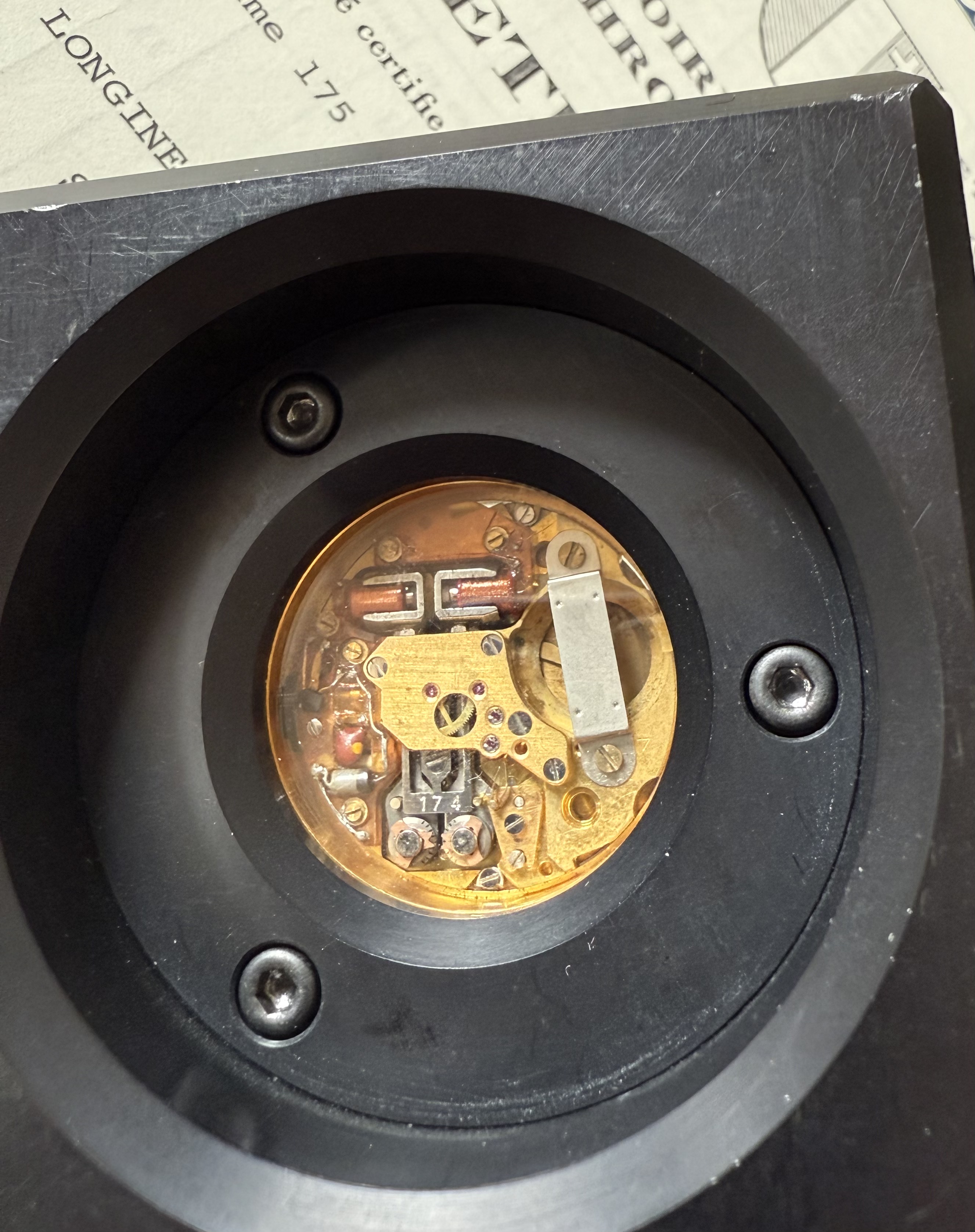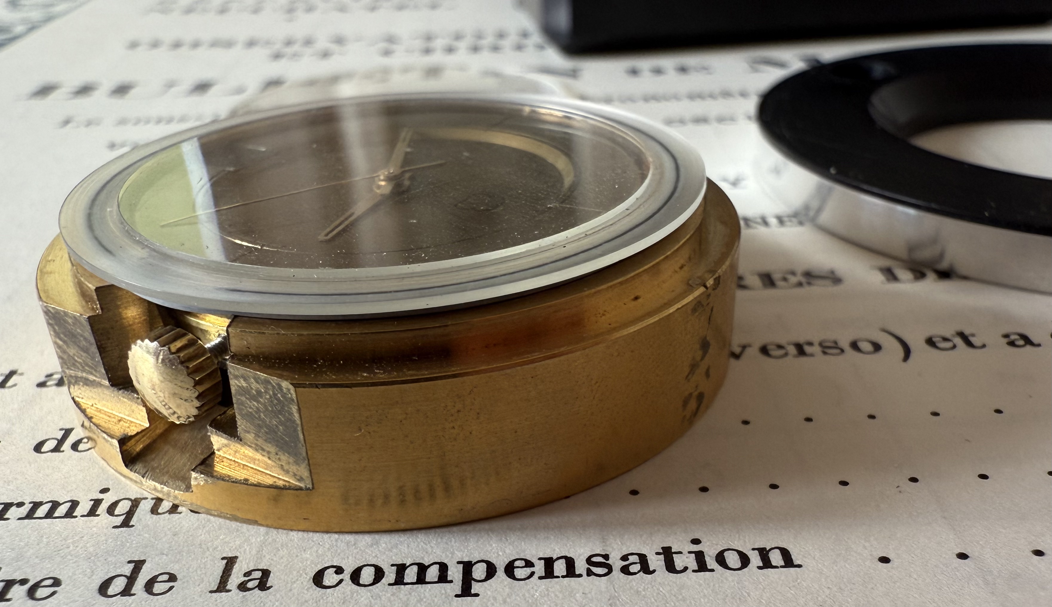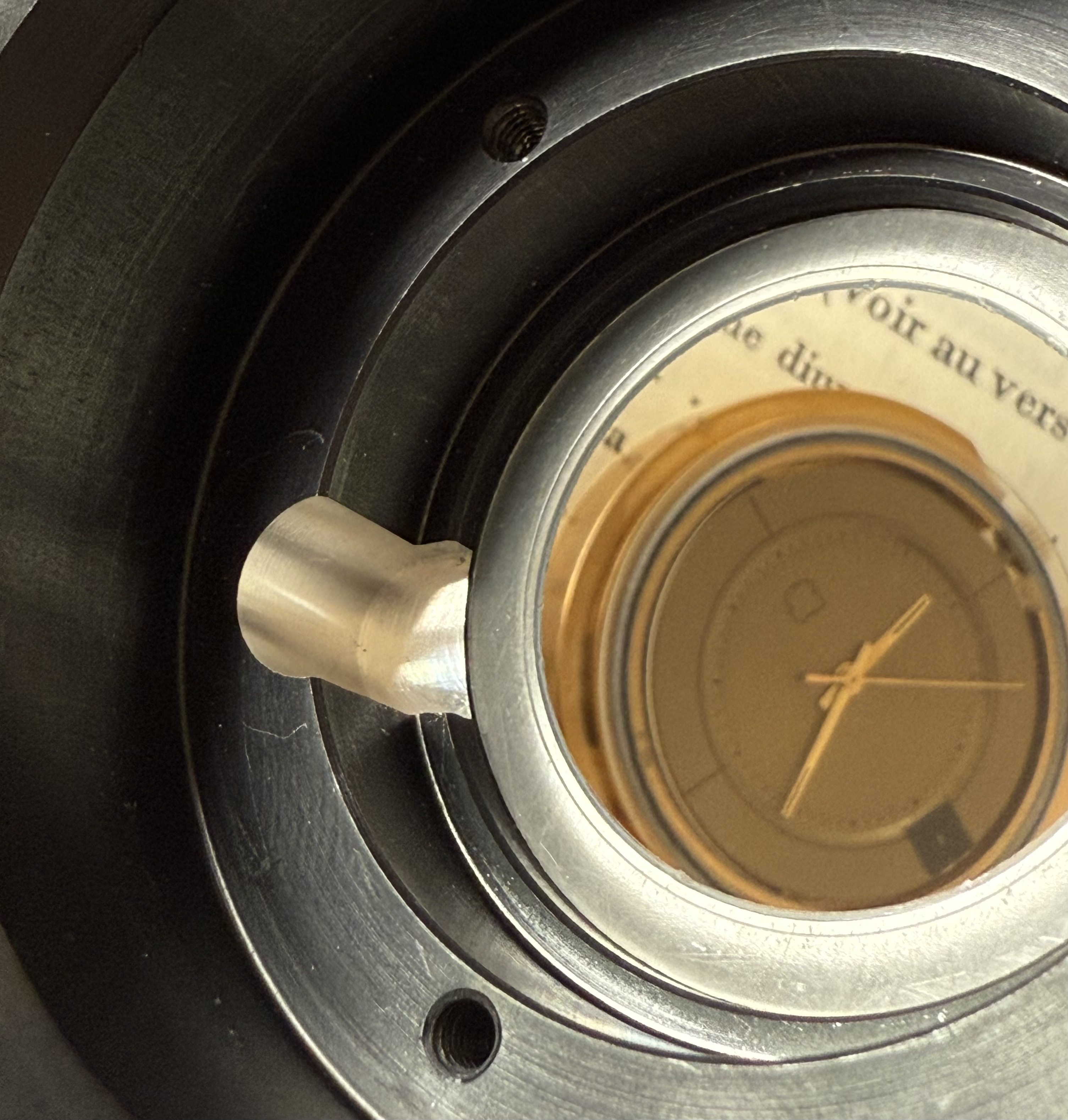Additional Info: The most striking feature of this prototype setting is the black chronometer competition case. What at first seems to be an aesthetic choice, reveals itself as a highly specific technological feature for ensuring optimal conditions to perform absolute precision. The aluminium casing is completely covered in hard and thick black anodisation to render the aluminium less conductive and thus protect the electro-magnetic caliber from surrounding currents. The technology for black anodisation was know for a while and the Swiss company ‘Alusuisse’ was a global leader in these processes. André Beyner, lead engineer of the MOSABA project at Ebauches SA worked for ‘Alusuisse’, before being employed at Ebauches SA. Thus Beyner new and understood the material properties of aluminium, which lead to the presumption that at least the case treatment was made in collaboration with ‘Alusuisse’.