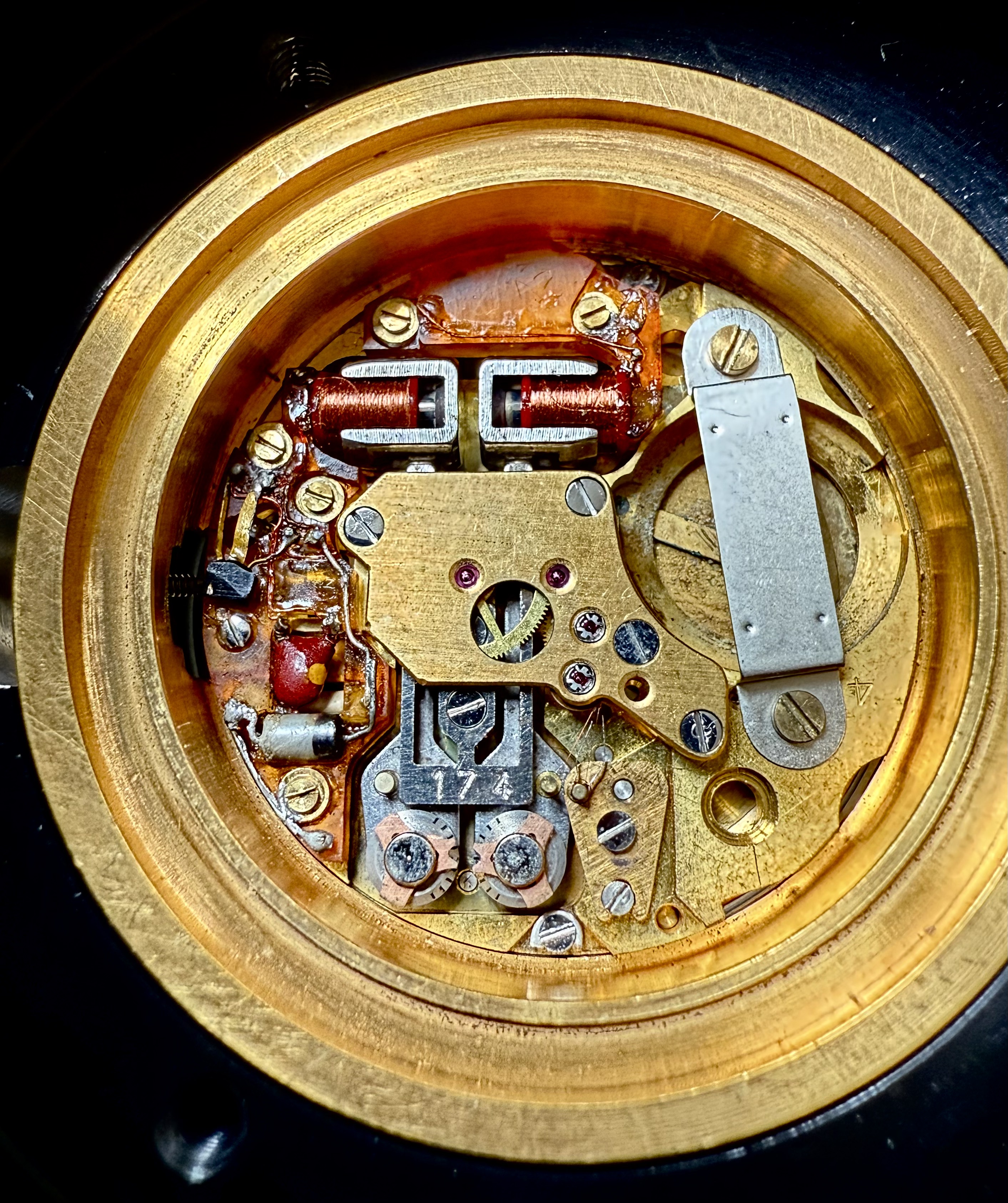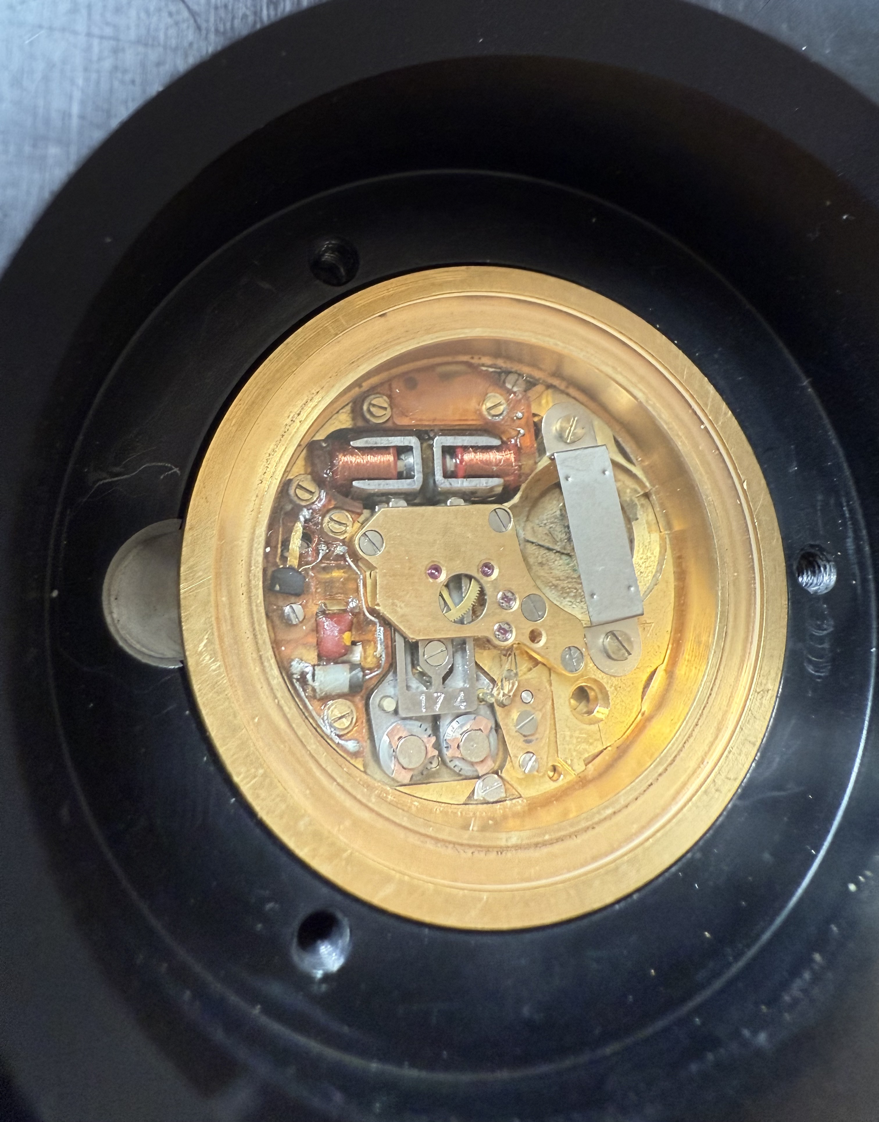 The layout of the caliber corresponds mostly to the definitive version, but the large back plate, which later covers most of the metal tuning fork is much smaller. The indexes are not at the their definitive position. The electronics is assembled and soldered by hand, there are also some hints pointing towards hand modification of the wheel work. The weight, which is applied on top of the metal tuning fork is stamped with ‘174’. The index fingers are flanked by small, metal sheets which seem to act as adjustment guides.