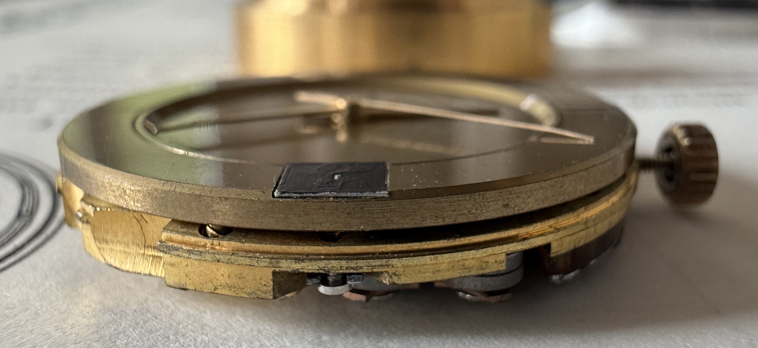 The caliber itself is mounted with two screws to a custom made brass movement holder and retains a stem and gilt, brass crown, which are hidden underneath the aluminium and acrylic covers. Caliber and movement holder are press fitted inside the case by means of a glazed (acrylic) black anodised aluminium cover fixed with 3 screws.