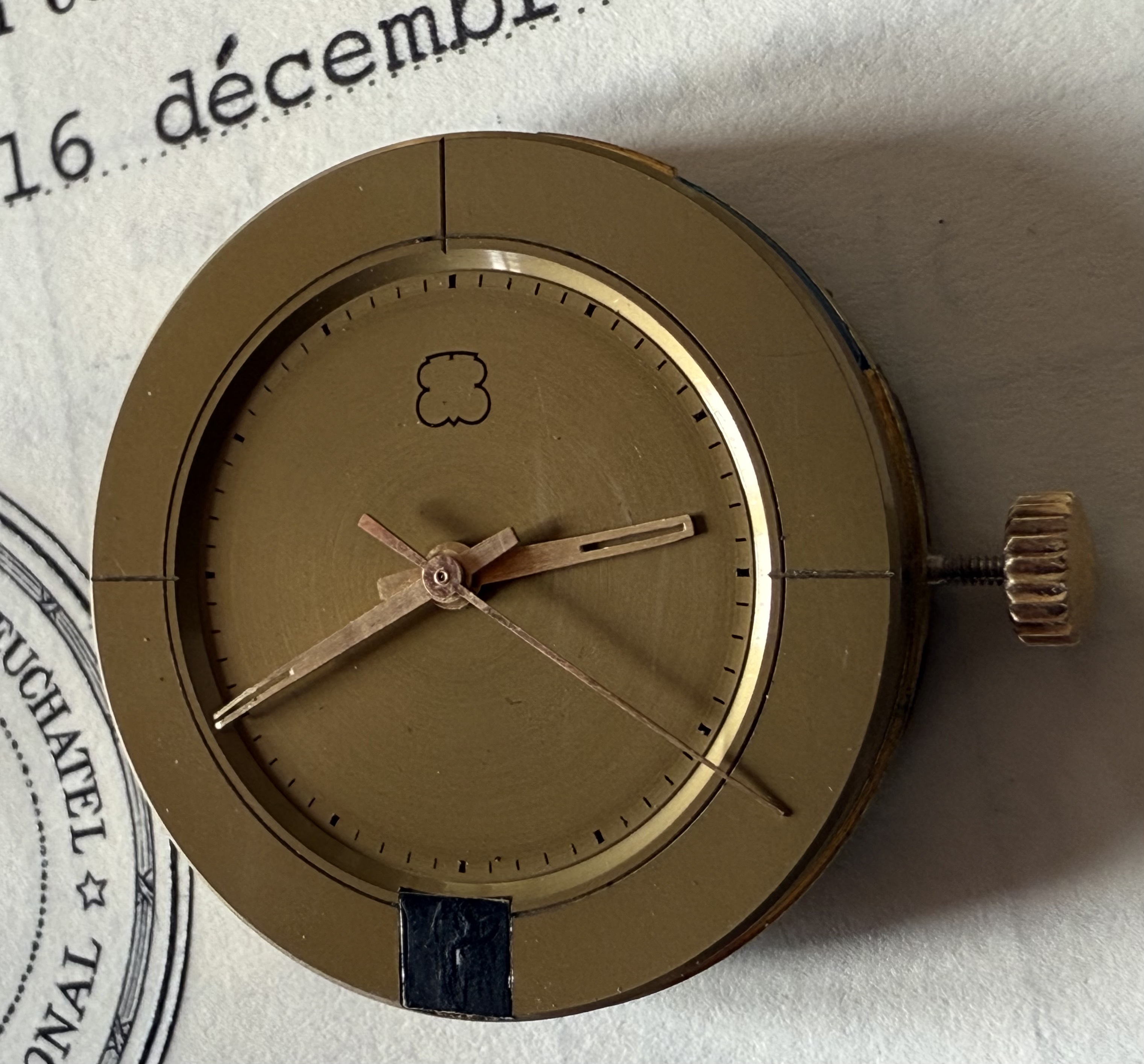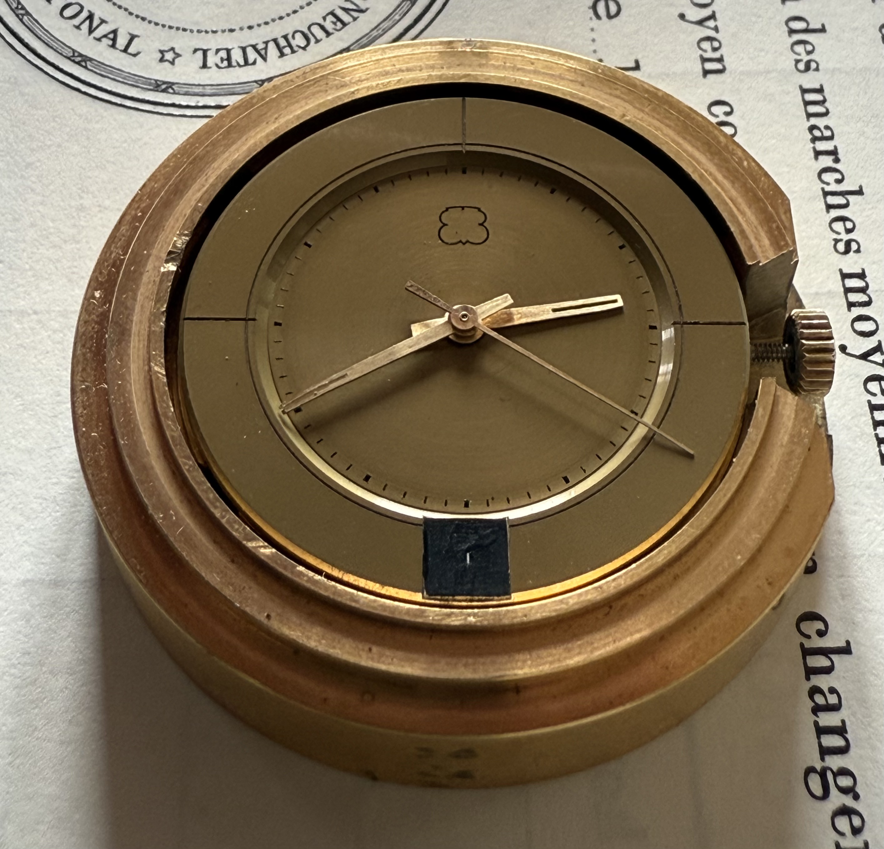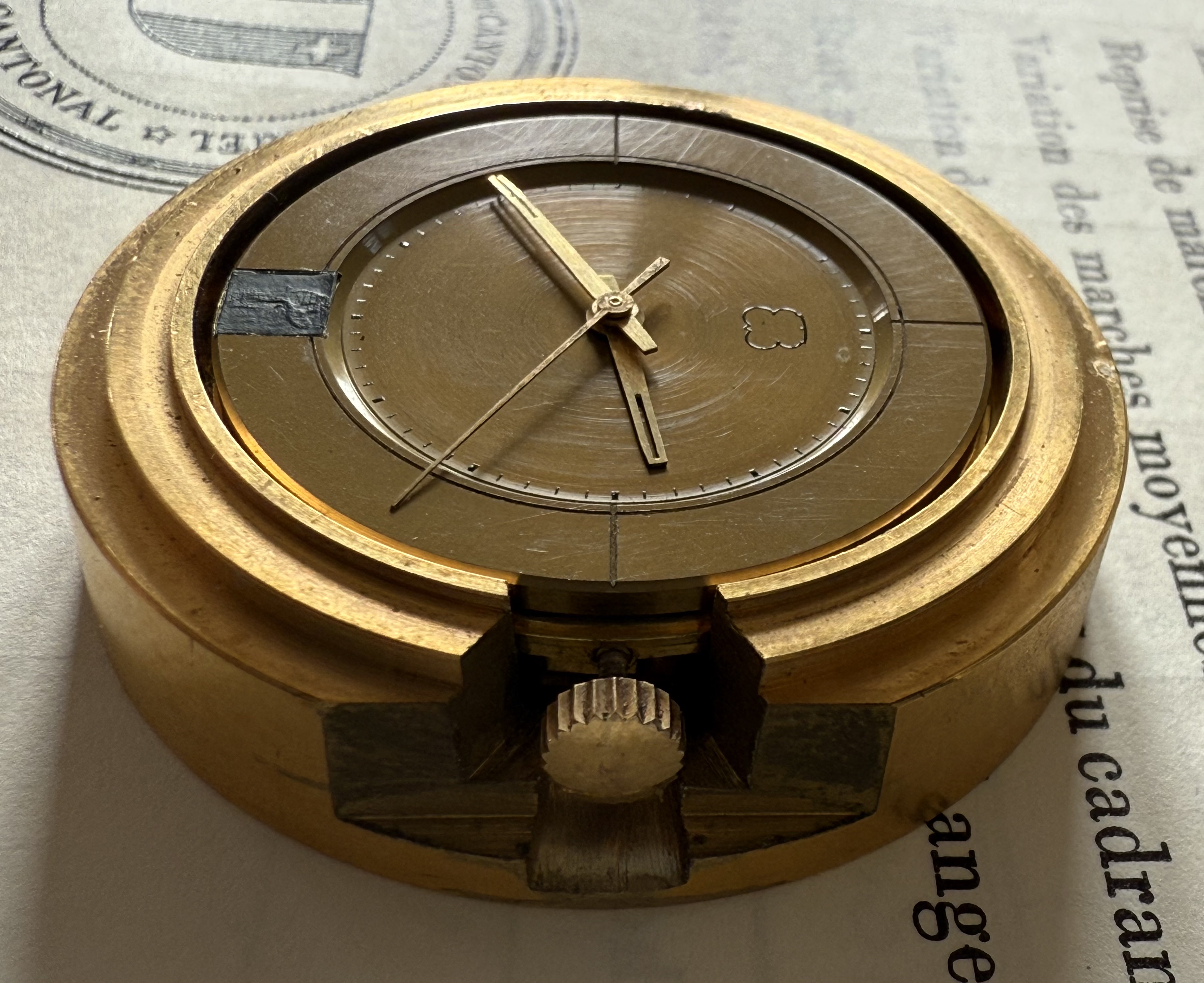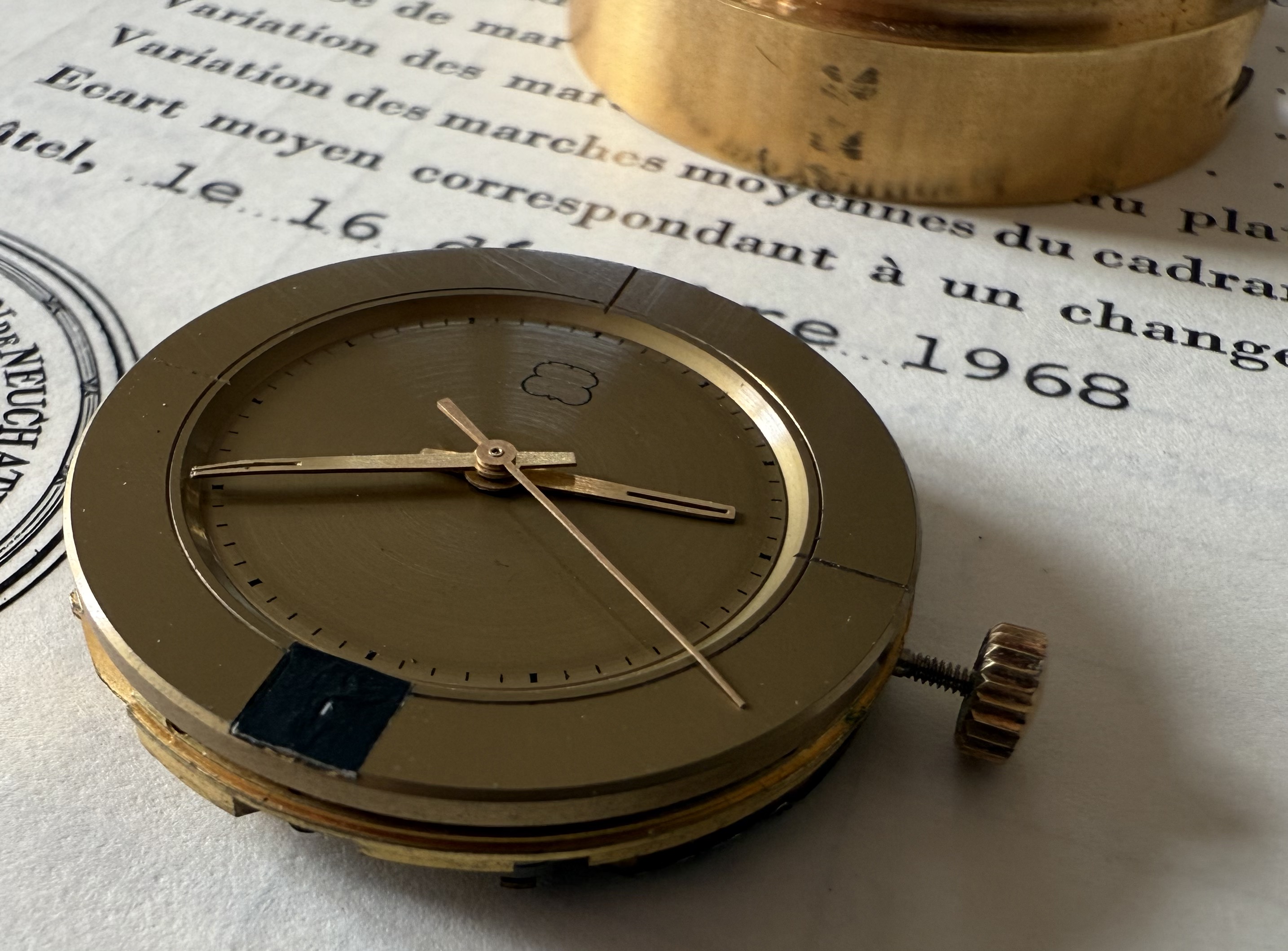 Apart of the prototype number ‘4’ stamped on the main plate, there is no other information on the caliber itself. This caliber was made before the licence agreement with Bulova was finalised (end 1967), so there is no mentioning of the ‘Bulova patent’ neither on the caliber, nor on the chronometer competition case.
