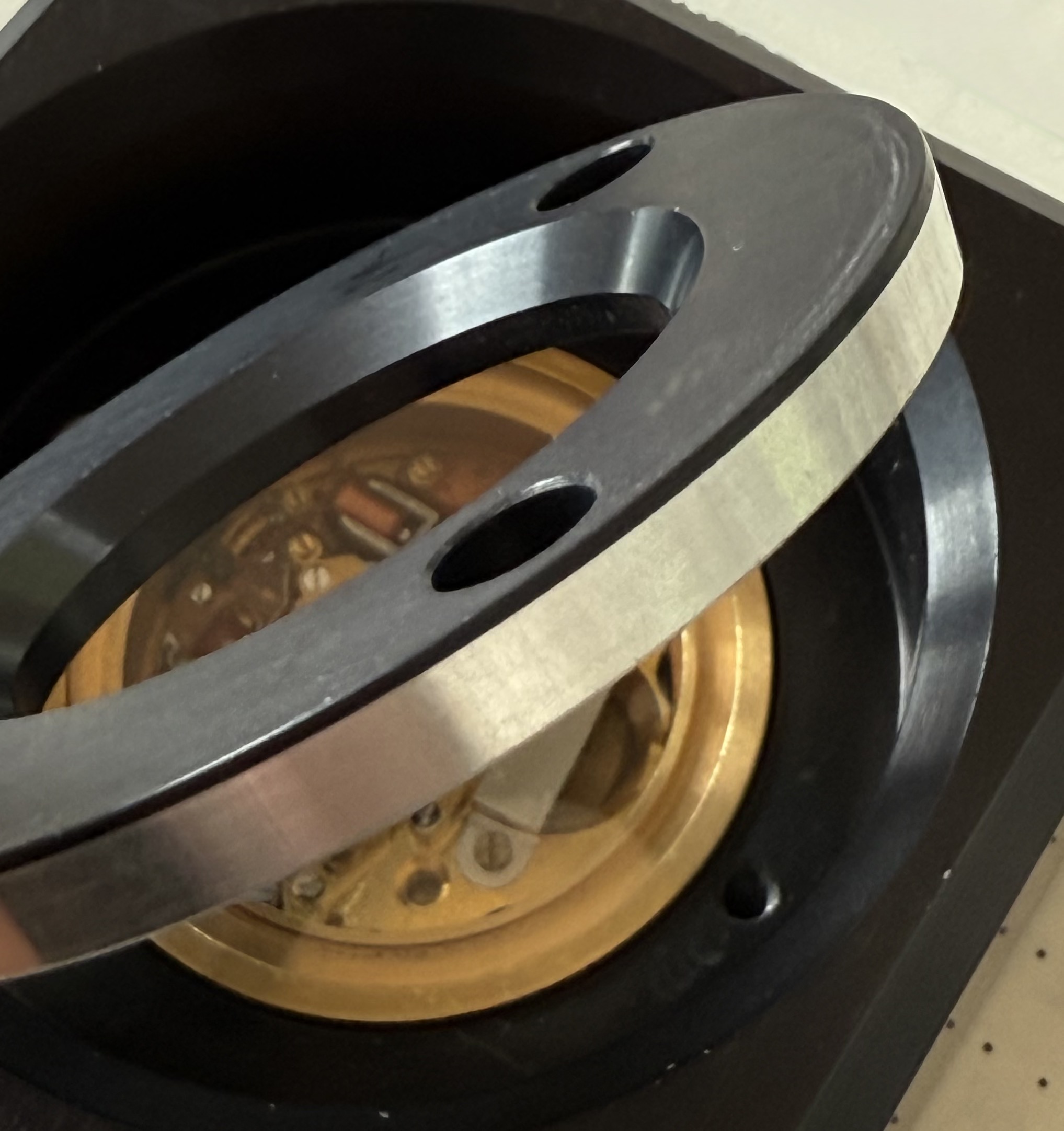 Description: Observatory chronometer competition cased, MOSABA caliber prototype. Two part case made of black anodised aluminium and acrylic. Complex, brass movement holder with bilateral acrylic crystals and rubber gaskets. Movement is partially gilt, some elements remain plain brass. Brass dial with central recess, ‘Ebauches SA’ logo printed in black under ’12’. Incised ’12, 3, 9′ markers. Rectangular recess at ‘6’ to accept large, uncut precision detection sticker. Black printed minute track. Gilt hands.