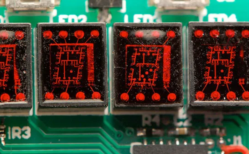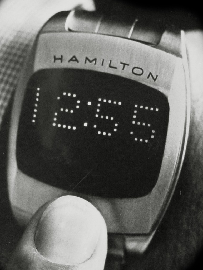 The futuristic display of time using luminous numbers was brought to a broad public in 1968 by the movie ‘2001 – A Space Odyssey’, for which the Hamilton watch company was contracted to provide the on screen renderings of time display. The first functioning prototypes developed by Hamilton in collaboration with Electro-Data, founded by George H. Thiess, were ready in 1970 (1).
