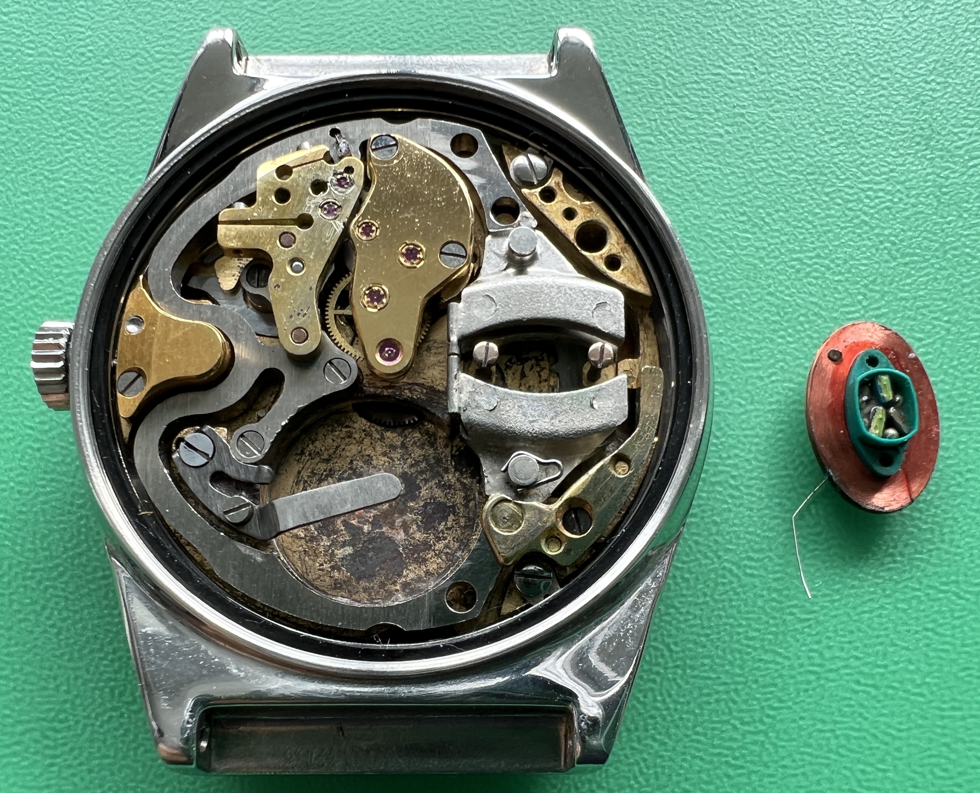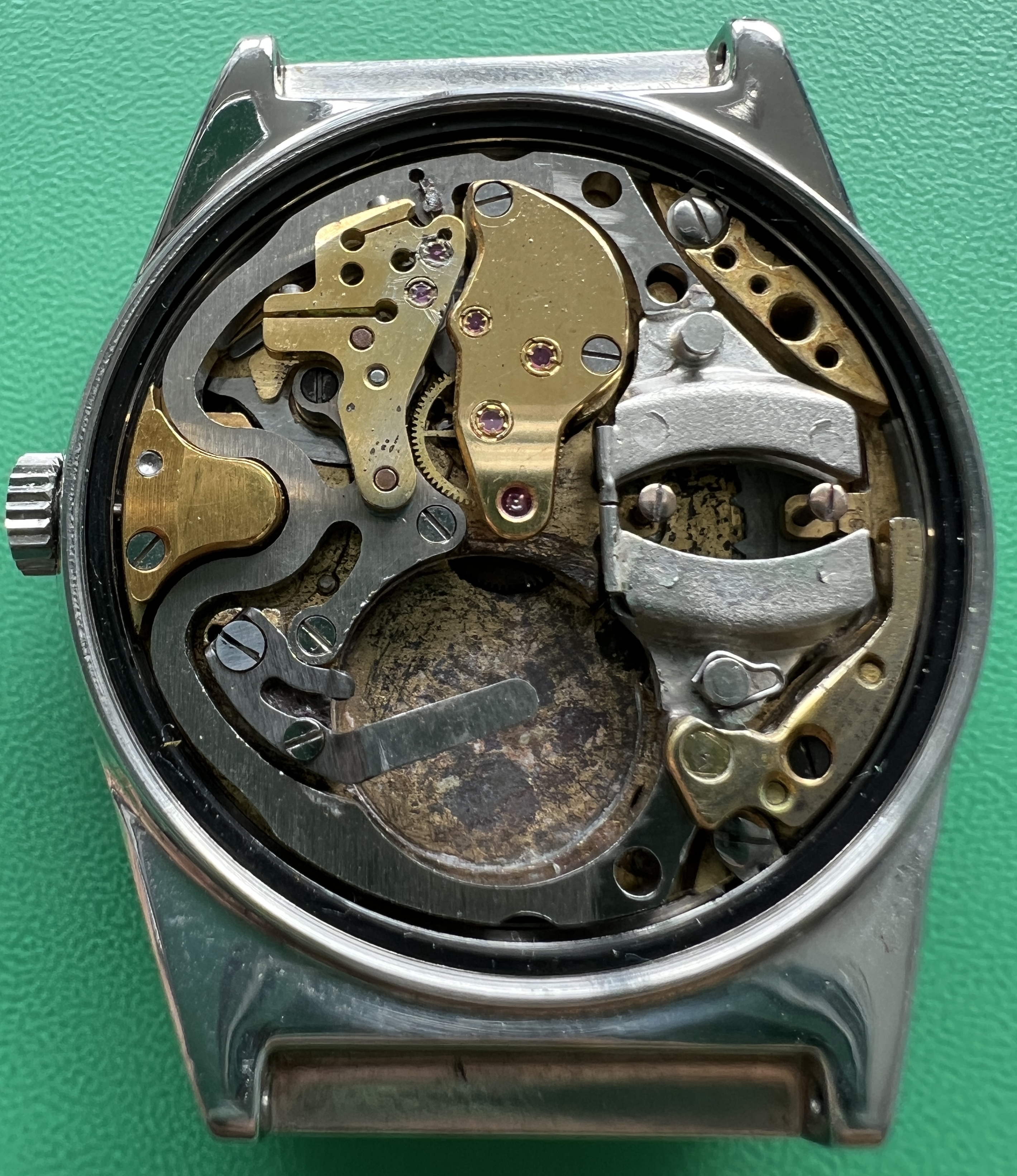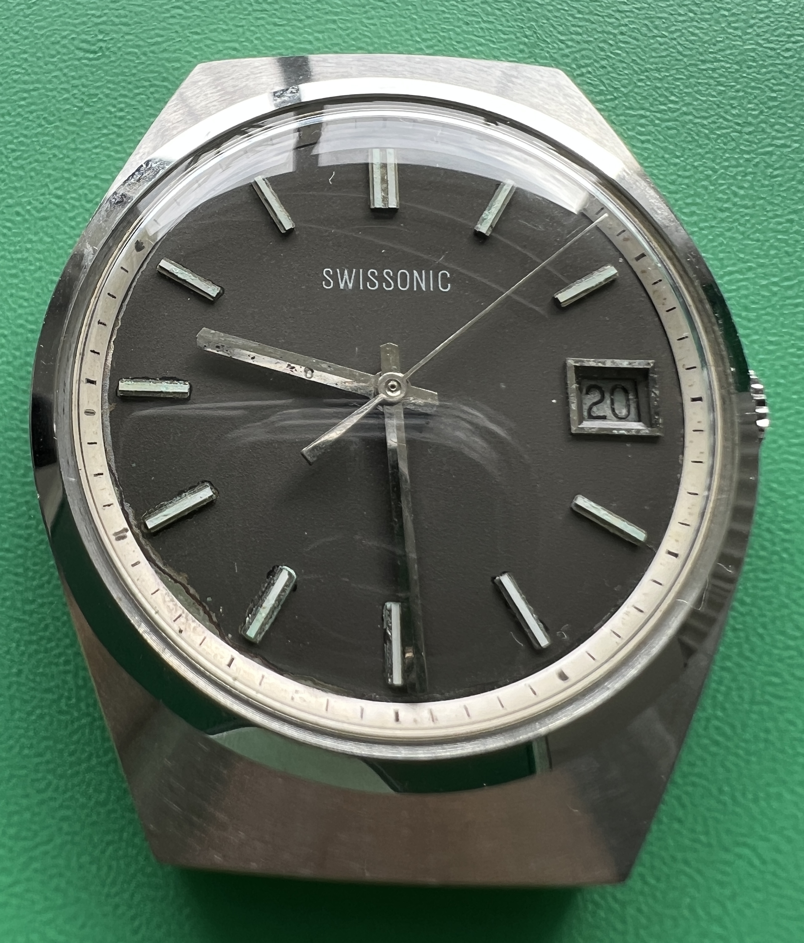 Description: Stainless steel cased prototype. Stainless steel case back, inside stamped with prototype number ‘1581’ and ‘FB’ standing for ‘François Borgel’, see below. The prototype number ‘1581’ is also embossed on one of the surfaces facing the lugs. Anthrazite coloured brass dial with raised 5 minute markers, white peripherial minute track with black printed minute marks. White printed ‘Swissonic’ at ’12’ and ‘Swiss’ at 6′. Date window at ‘3’. Silvered, thin hour, minute and seconds hand. Acrylic crystal. Anonymous stainless steel crown.