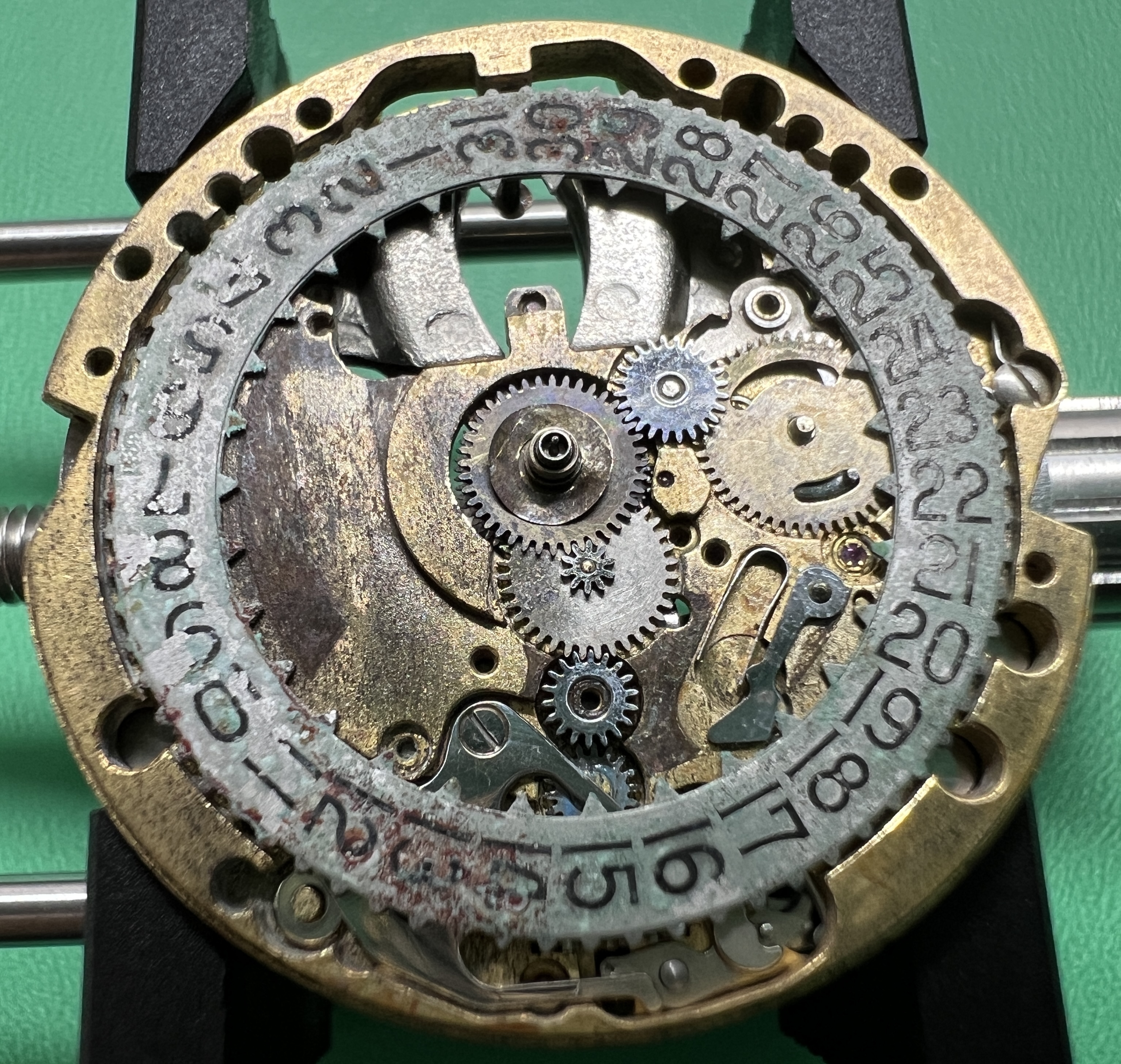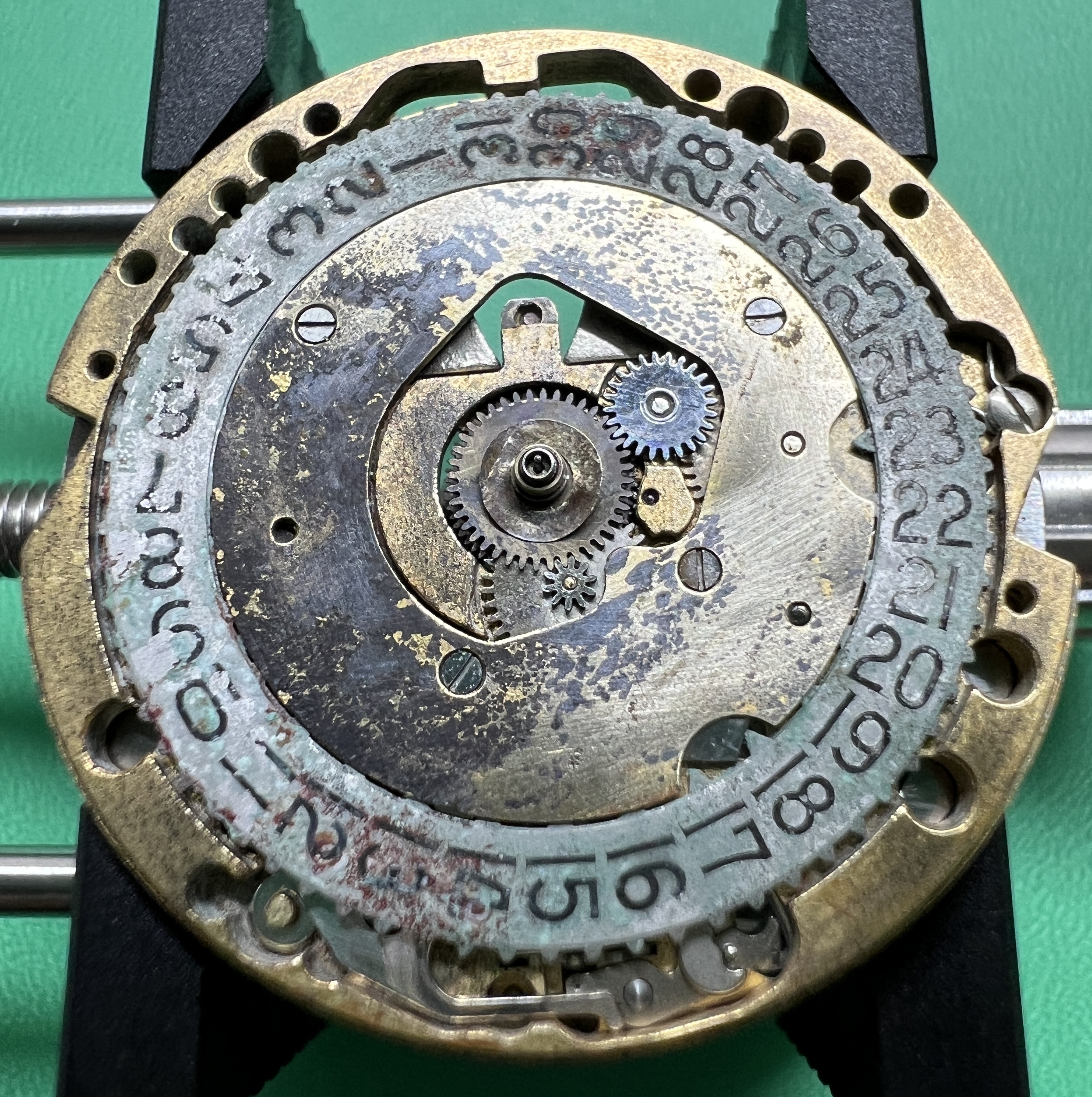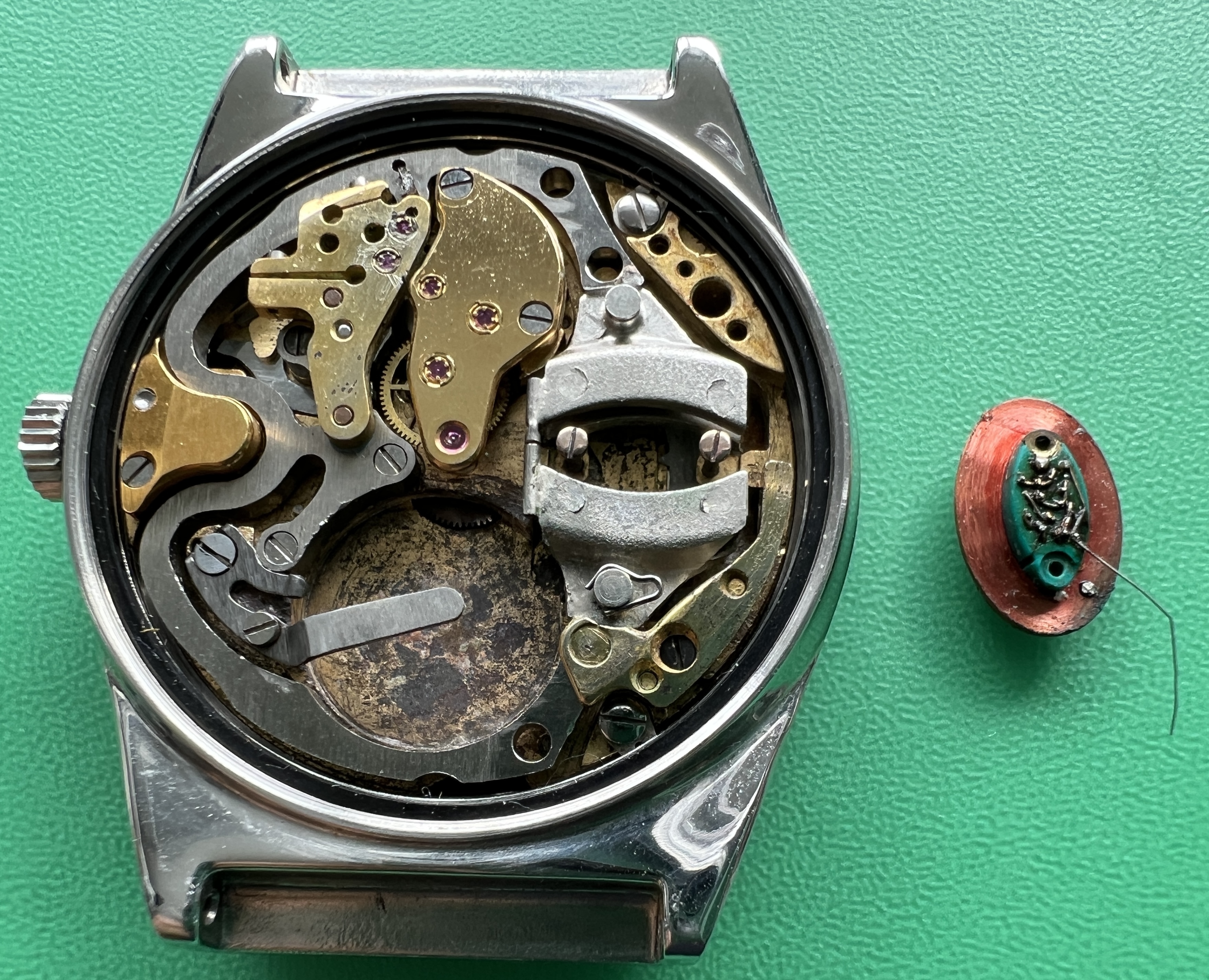 Description: Stainless steel cased prototype. Stainless steel case back, inside stamped with prototype number ‘1581’ and ‘FB’ standing for ‘François Borgel’, see below. The prototype number ‘1581’ is also embossed on one of the surfaces facing the lugs. Anthrazite coloured brass dial with raised 5 minute markers, white peripherial minute track with black printed minute marks. White printed ‘Swissonic’ at ’12’ and ‘Swiss’ at 6′. Date window at ‘3’. Silvered, thin hour, minute and seconds hand. Acrylic crystal. Anonymous stainless steel crown.