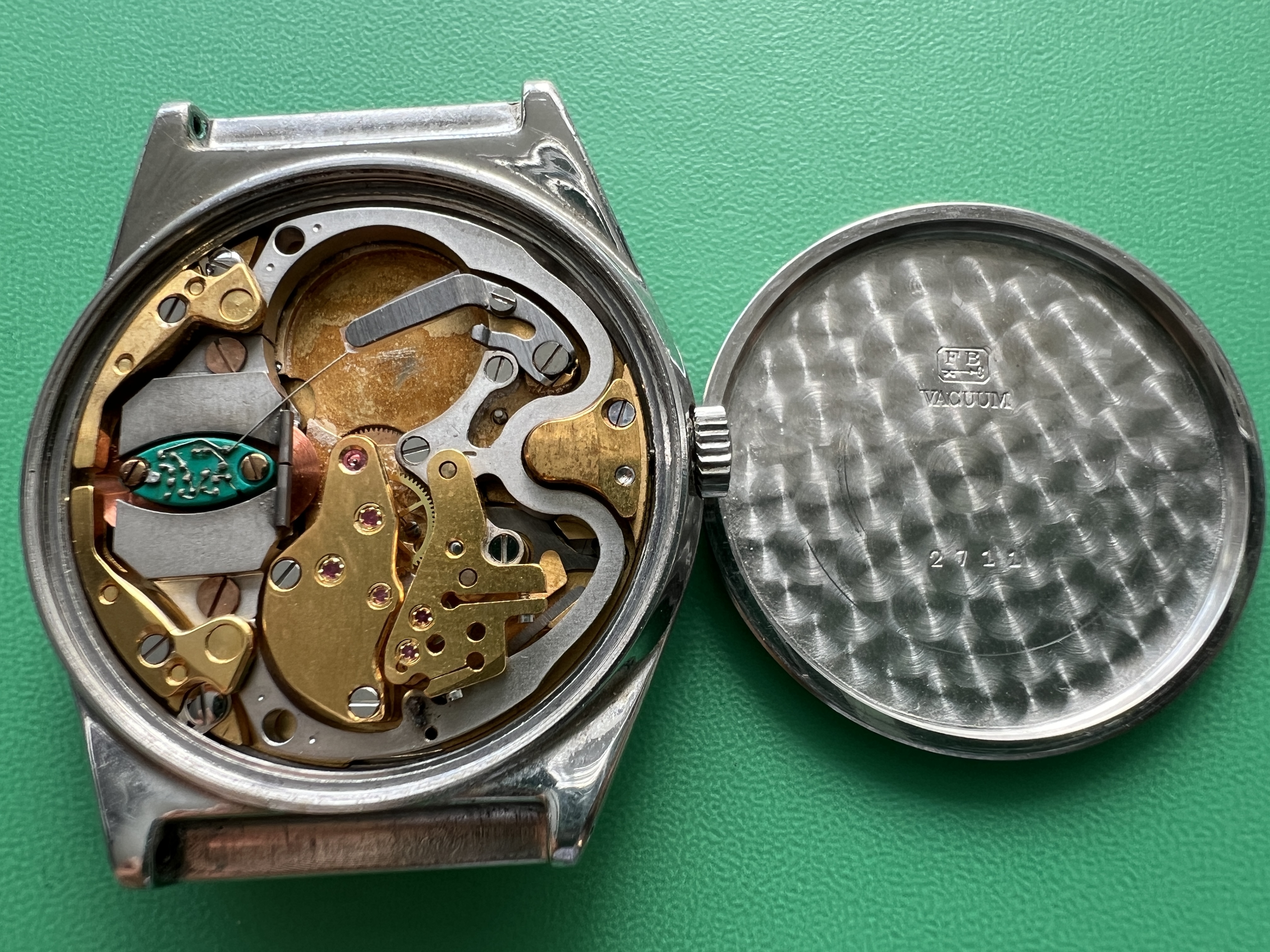 Description: Stainless steel cased prototype. Stainless steel case back, inside stamped with prototype number ‘2711’ and ‘FB’ standing for ‘François Borgel’, see below. The prototype number ‘2711’ is also embossed on one of the surfaces facing the lugs. White brass dial with raised 5 minute markers with black dots, white peripherial minute track with black printed minute marks. White printed ‘Swissonic’ at ‘6’ and ‘Swiss Made’ at 6′. Date window at ‘3’. Silvered, thin hour, minute and seconds hand. Acrylic crystal. Anonymous stainless steel crown.